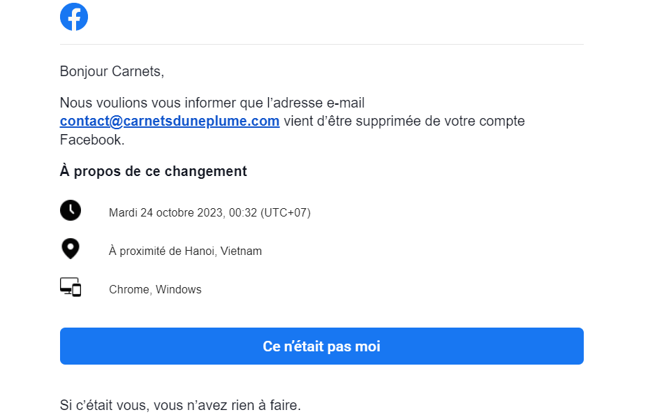 Comment cela s’est passé ? Eh bien j’ai reçu des emails de Facebook sur l’adresse email dédiée à ce blog me notifiant, dans la même minute, que cette même adresse email avait été supprimée de mon compte ainsi que mon numéro de téléphone… Et de quel endroit dans le monde j’avais eu subitement envie de les supprimer en même temps : Hanoï, Viêtnam.